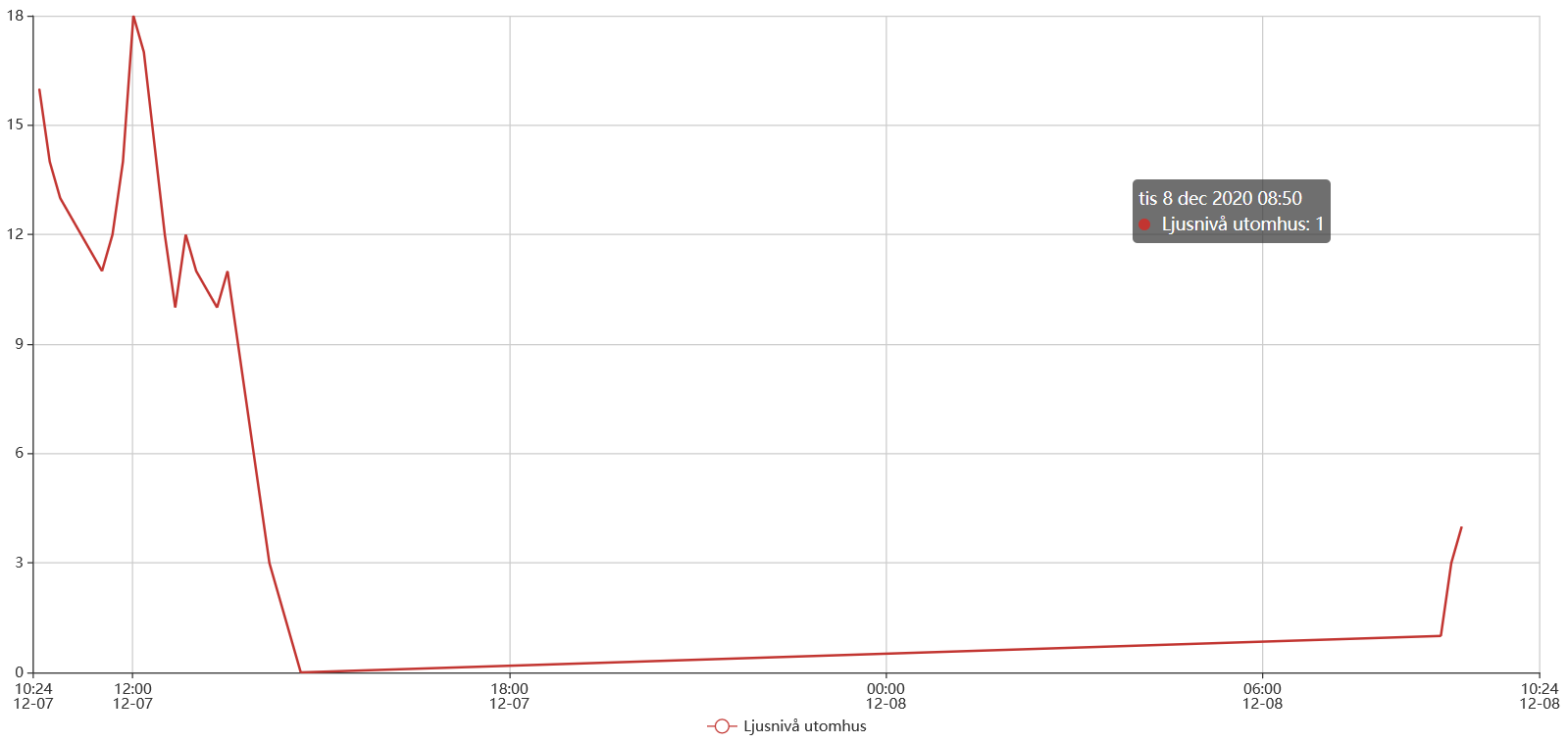 It was completely dark here from yesterday 14:40 till today 08:50 (Between those points in time nothing was saved in the database since the level didn’t change). Looking at the graph though you get the feeling that during those points the light level is slowly rising during the night, which kinda gives the wrong impression. Is this anything that could be done anything about? Or is it a question about me needing to persist values not only when changing but also periodically?