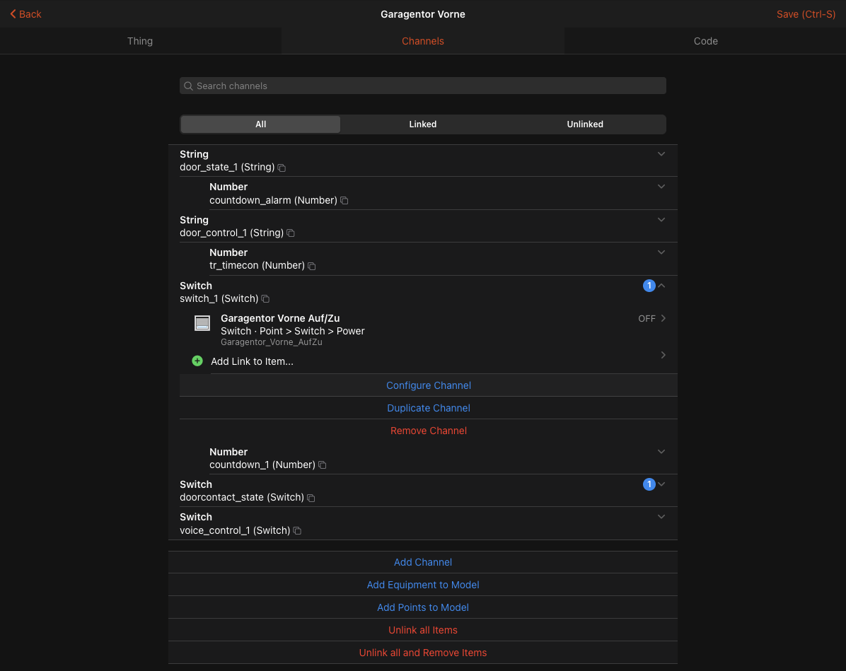 So far so good, if it was not for Openhab I would be done now. The Tuya binding works only with OH5, so I first upgraded to the version, then installed the binding. To set the binding up, you need to follow the binding’s manual meticulously - it took a few minutes but it worked for me. Then next, I created an appropriate Tuya Cloud Project “Thing” in OH, using the UI. That immediately went online. The binding supports discovery, so now it was easy to add a Thing for my garage door to OH as well. Next, I created and connected two Switch items, one for status and one for opening/closing: