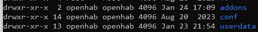 Permissions, the folders and files belong to openhab:openhab. That should also be ok.
