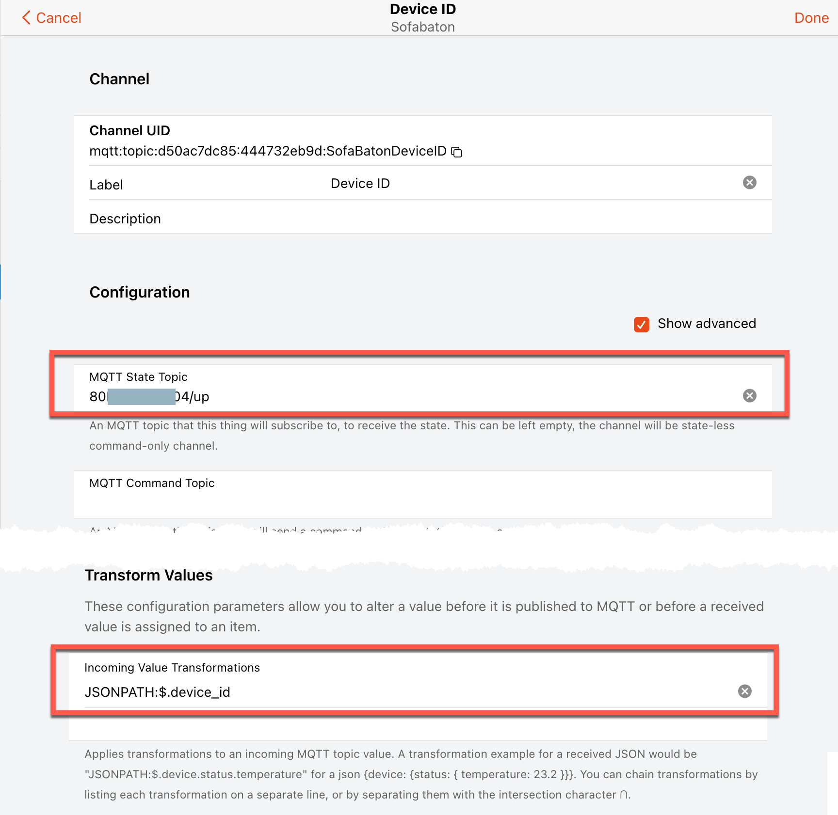 Create 2 channels: one for the Device_ID, one for the Key_ID. In both of these, add your ‘topic’ from the Sofabaton command into ‘State Topic’. Remember to add the ‘/up’. So your command should be: