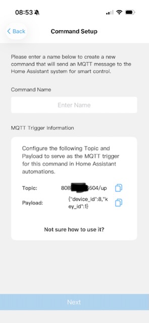 You’ll see a ‘Topic’ and ‘Payload’ displayed under the command name. These are the important codes you need to copy and use in Openhab.