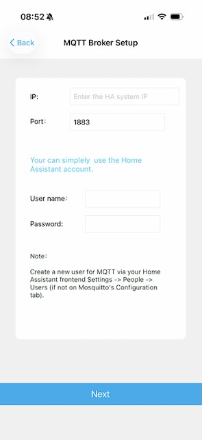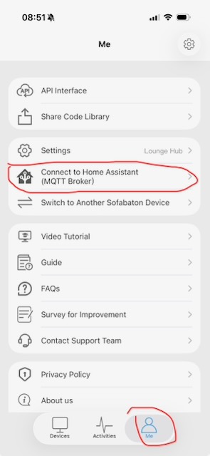 From the Sofabaton App, choose ‘Me’ in the bottom right, then ‘Connect to Home Assistant’