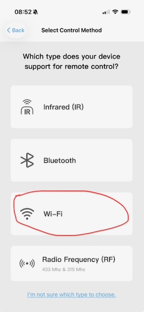 Still in the app, go to the devices screen and hit the + sign to add a new device. Choose ‘Wi-Fi’ control method.