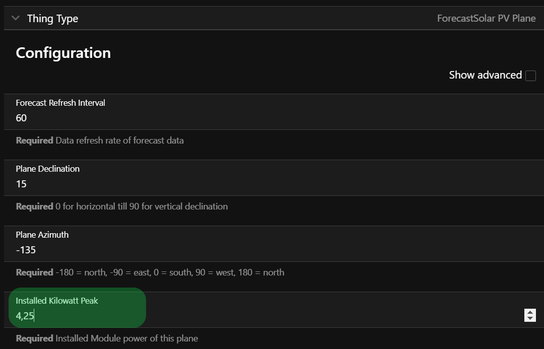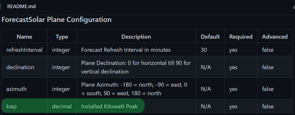I don’t know if this has been mentioned here, but for ForecastSolar you only allow full values, no floating values. Since I only have a small 0,8 kWp solar module i checked their api. It is actually possible to use float values. I just changed the value from 1 to 0.8 in the Openhab code section and it still works.
