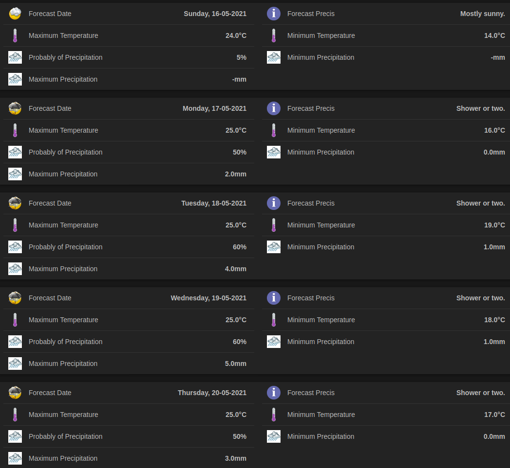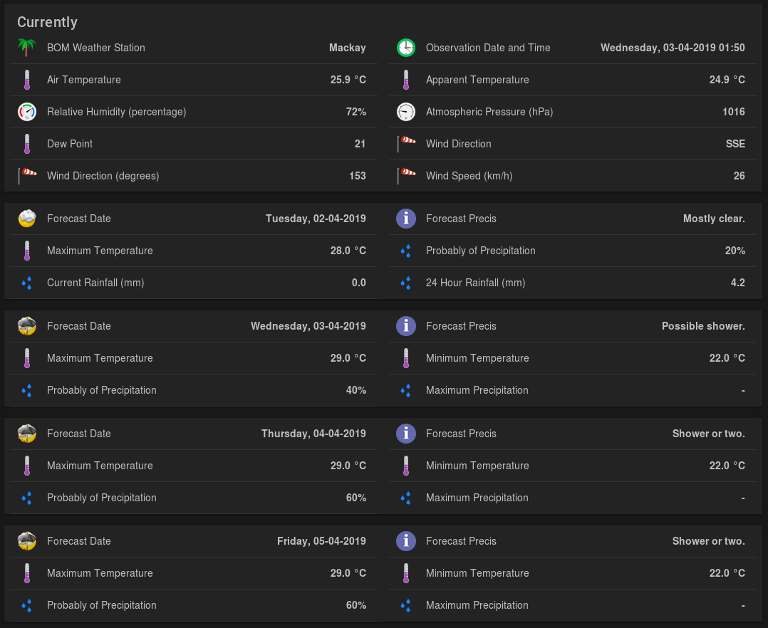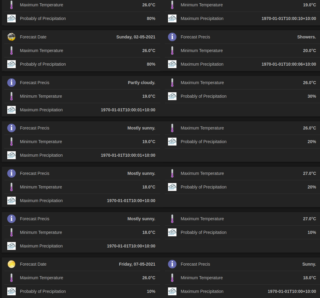 Also noticed in the xml files there are no “precipitation_range” data in the first 4 or 5 days, so much of the problems could stem from that. I’m sure they used to have that data, I might have to contact BOM and clarify.