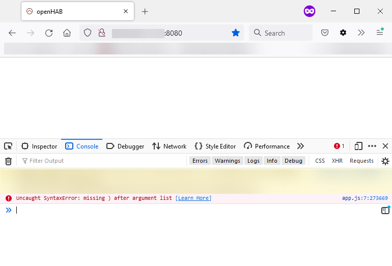 So what I noticed a bit after my post was that the events were still flowing in the log file. The app was working also, but the web GUI was still not working properly. I checked several tabs from the Developer Tools (Firefox), and when I was on the AdBlock part, suddenly the page got displayed. AdBlock Plus and any other plugins are disabled for the site. So this is really something weird… No idea what happened.