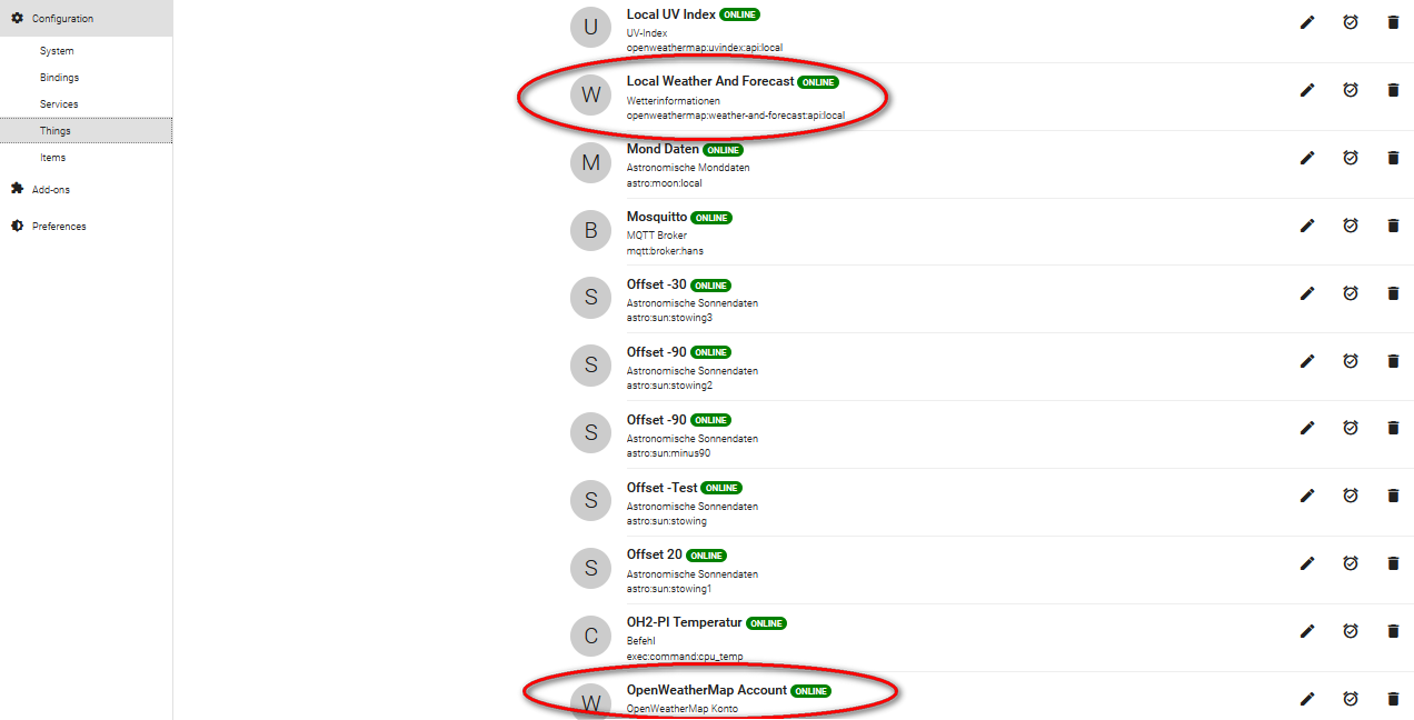 Bridge openweathermap:weather-api:api "OpenWeatherMap Account" [apikey="XXX", refreshInterval=10, language="de"] {
