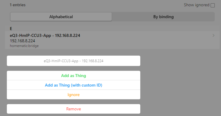 HomeMatic CCU3 (still running as an ESXi VM as mentioned above) is already successfully added as Bridge, the screenshot above shows the actual Inbox (obviously ) with the entry in question. It does not matter whether adding, ignoring or removing the entry (“trying to…”), it states