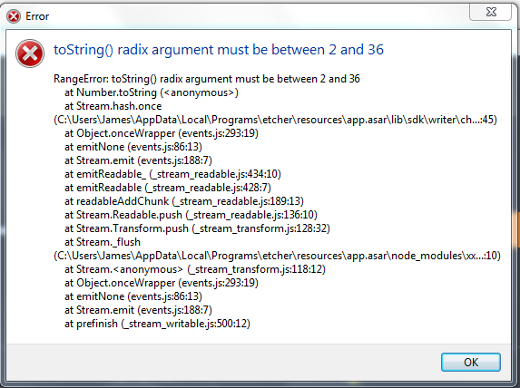 I formatted SD card using SD Formatter. When Etcher gets to 100% it crashes with an error about “radix argument” and leaves sd card unaddressable. Does anyone know what this might be? Tried 3 times with identical result. SD card is 16GB.