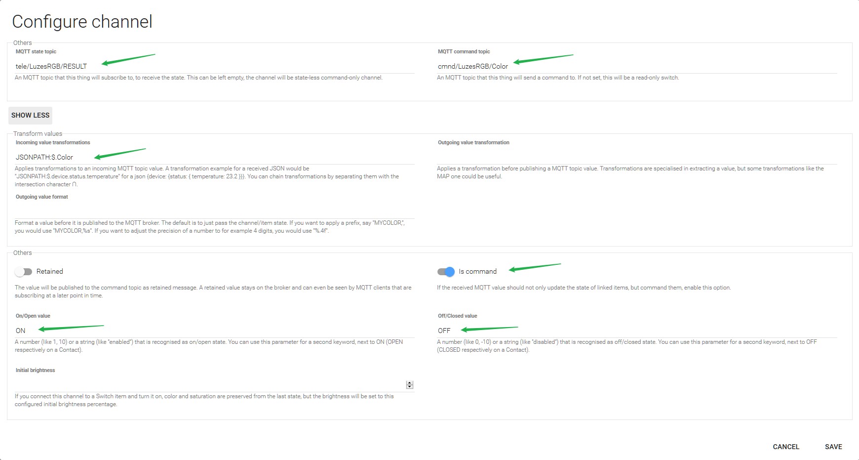 I then saw this line: 2020-03-14 11:06:57.837 [DEBUG] [qtt.generic.AbstractMQTTThingHandler] - Successfully published value 0.42000000 to topic cmnd/LuzesRGB/Dimmer