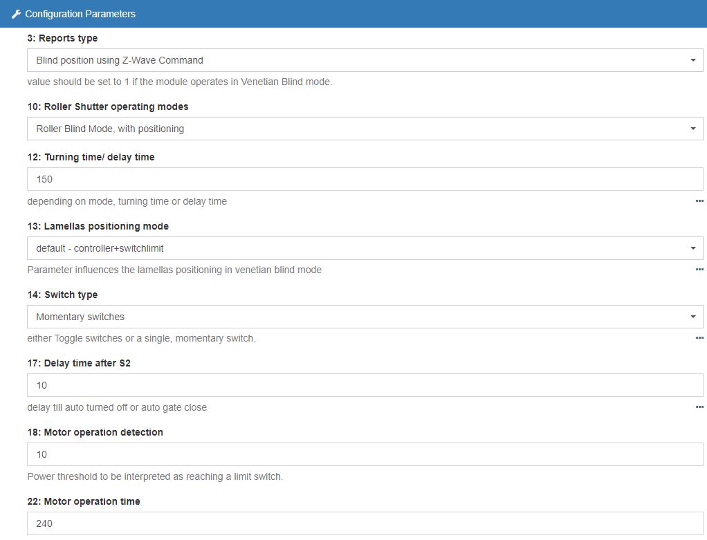 Hi, I have several Fibaro Rolleshutter 222 controlling all my blinds in openhab2 (last stable version), and they work fine when I try to control them from the android app, via rules or web interface. But if I switch them using the 3-position manual toggle, despite the blinds moving as expected, there isn’t any updates in openhab until the next polling cycle (in my case, every 30 min).