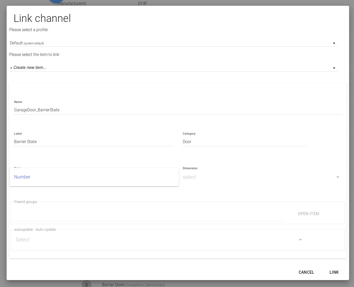 I’ve seen both of these data points already and this is where it gets confusing. It is probably just because I don’t know what I’m doing. It is obvious even to me. If I go to the Barrier State Channel on this Thing and try to add a new Item with a type value = Switch it is not available. Number is the only type available in the options.