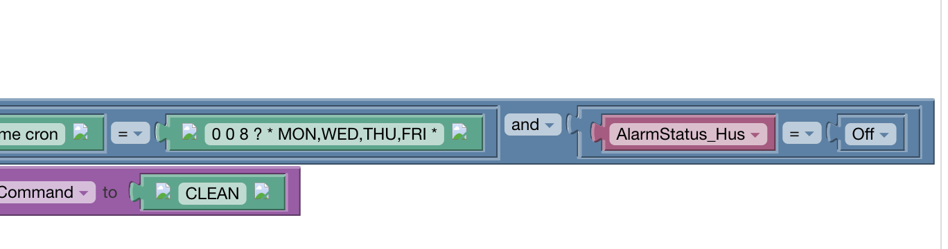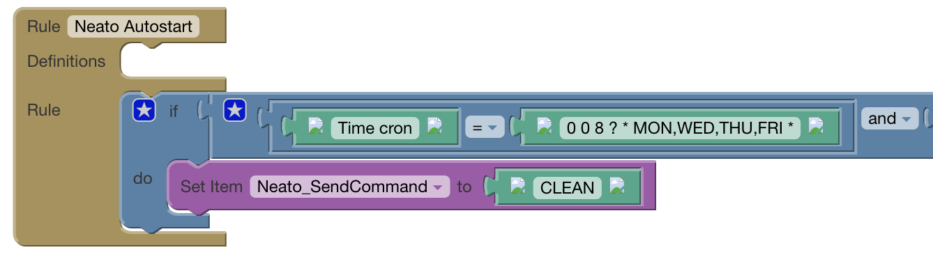 It’s a simple rule that sends a CLEAN command to my Neato vacuum cleaner. Monday, Wednesday,Thursday, Friday at 8.00, but only if the alarm in the house is armed. (Then, do not start if we go on a day off and sleep long).