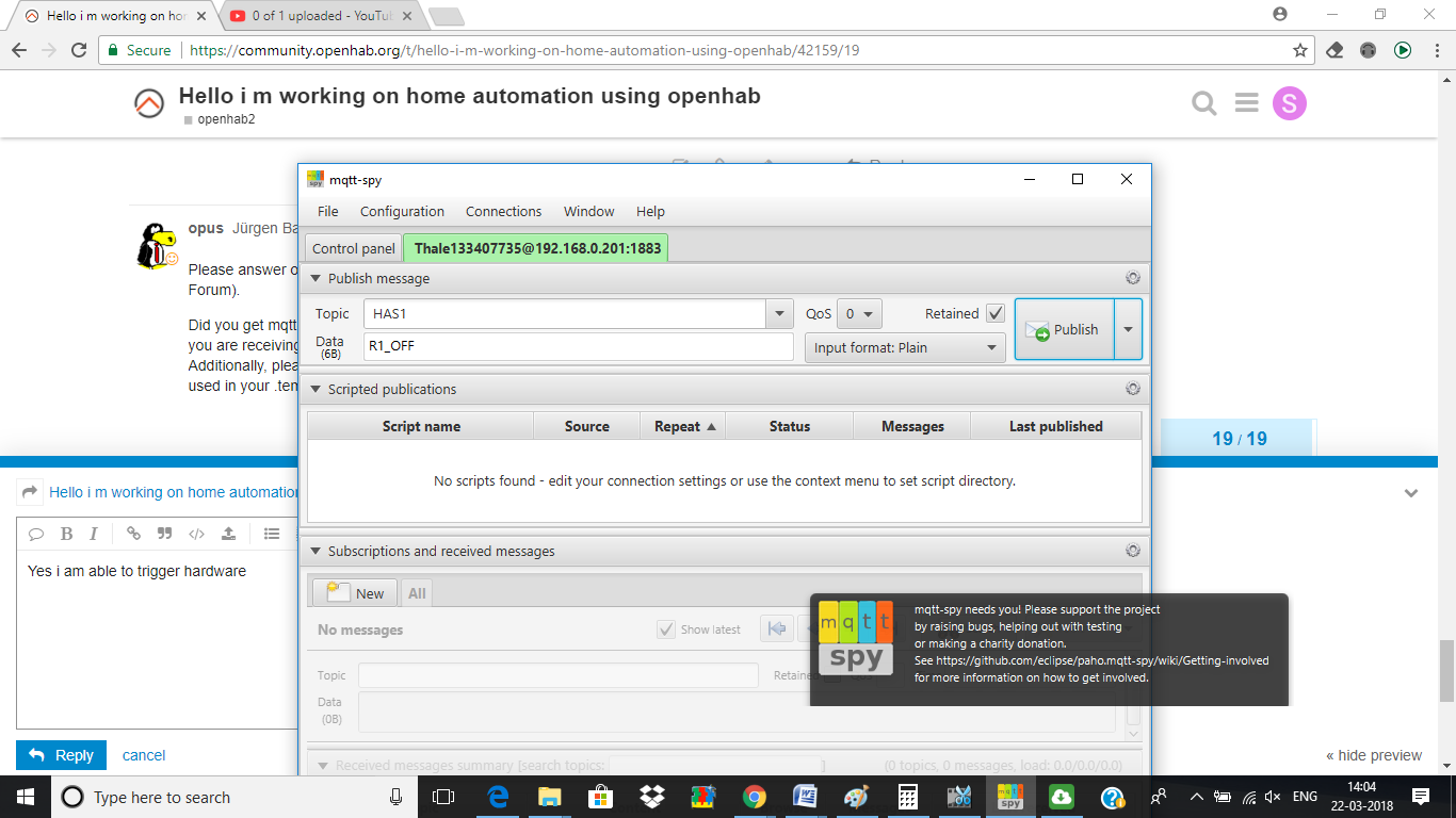 I could trigger hardware using my mqtt apps but not able to trigger thru openhab2.