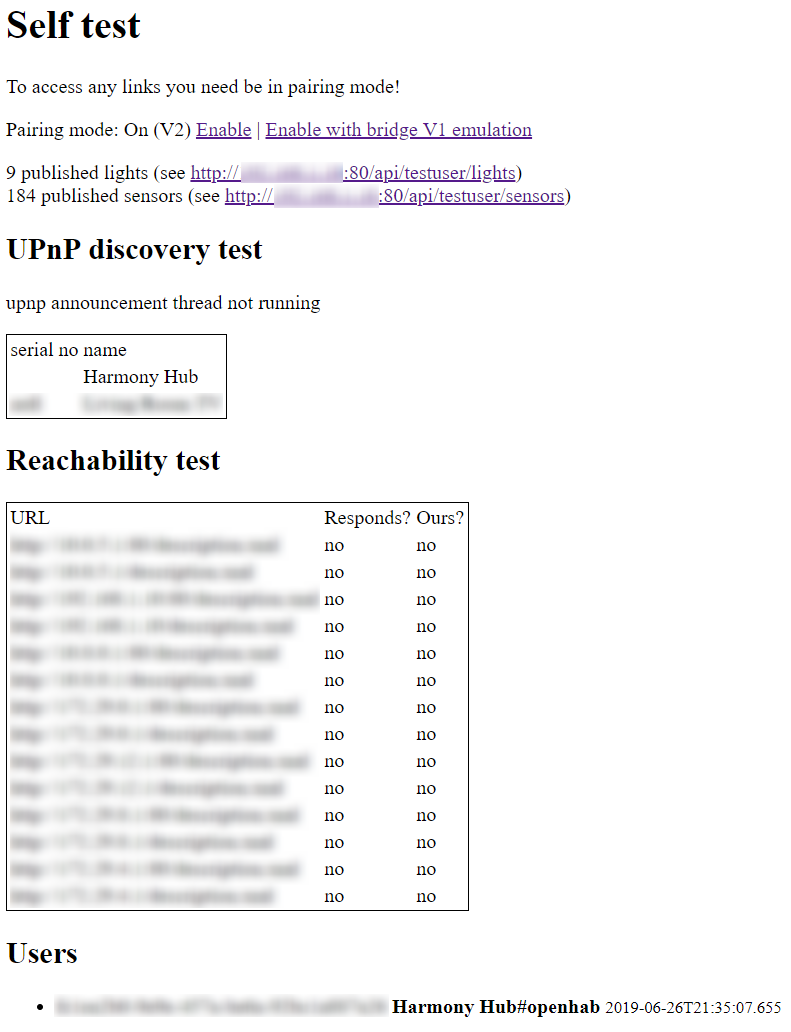 Looking at the self status page, none of the URLs are marked as responsive while I can access through my browser along with any of the URLs from the server where OH is running. I am using nginx to proxy into my OH server. Also, the binding seems to be able to pick devices broadcasting on my network including my Harmony Hub.