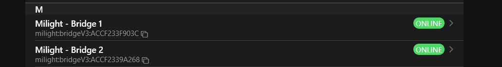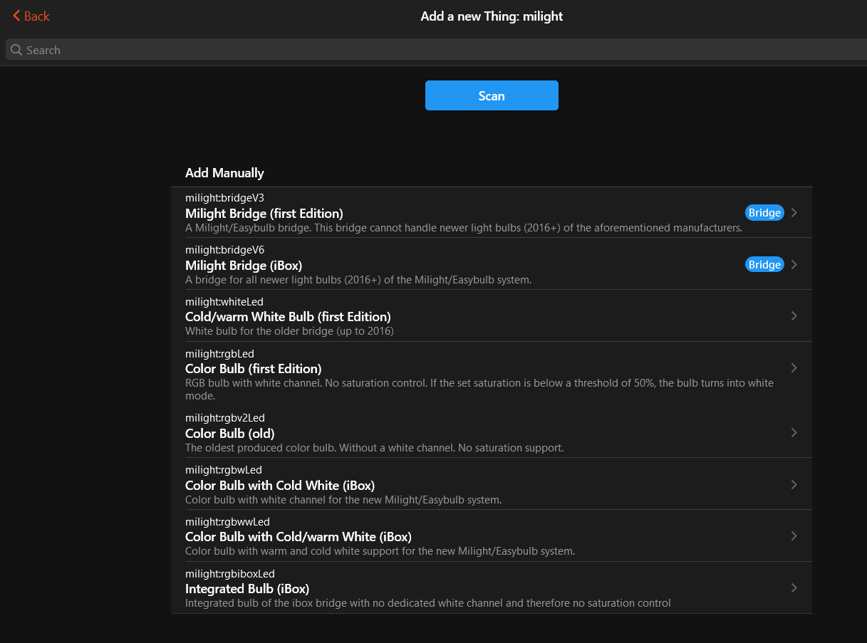 After migrating from textual config to UI my 2 autodetected MilightV3 Bridges are added but no channels available for item linking…