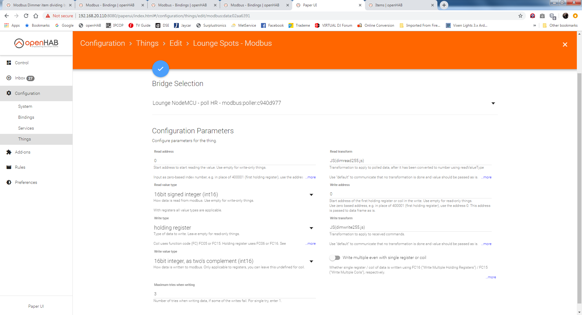 The Modbus bit of the configuration appears to work correctly. When I change the value as dimmer in Paper UI, the lights respond correctly. It’s only once I build a dimmer item against the dimmer channel that the flashing happens. The item responds correctly when the light level is changed in the NodeMCU but not when the item is commanded.