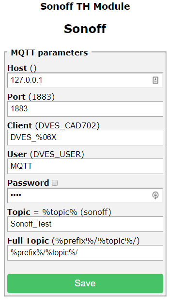 My test device is a Sonoff TH16 with Si7021 temperature sensor that’s been reprogrammed with Tasmota firmware. The Sonoff seems to be working just fine, I can log into it via my web browser, screen shot of the MQTT configuration below.
