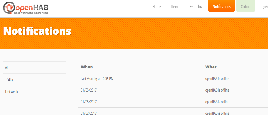 Today I logged in to myopenhab.org and noticed I have no items or event log or notifications for a while. Had online/offline notifications for a few days and it stopped.