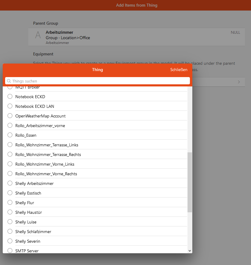 But then I can’t add equipment to office (Create equipment from thing). When I select the apropriate Thing, the window closes and I am back on the model page
