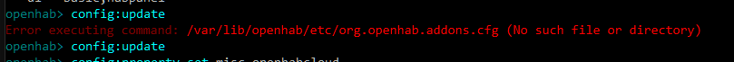 where as /openhab/userdata/config/org/openhab/addons.config seems to have the configs that caused the complaints. So I’ll just in case cat the addons.config to the end of /openhab/conf/services/addons.cfg which atm has none of those things set. Just to be safe if the cache gets cleaned.