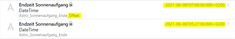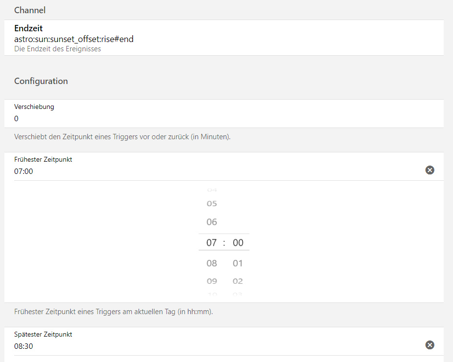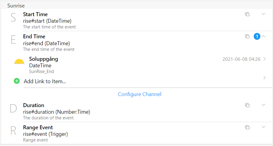 The rise#end channel has no offset configured, and displays the actual time of the sun rise.