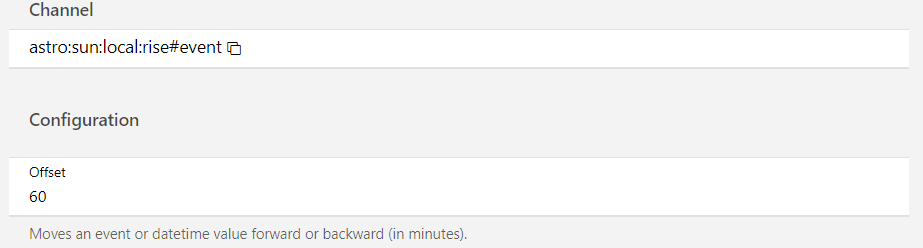 The offset only affects the channel itâs configured on. If you would have linked an Item to e.g. the rise#start channel, that would display the original time without offset applied, since thatâs only configured on the rise#end channel. Same goes for rise#event.