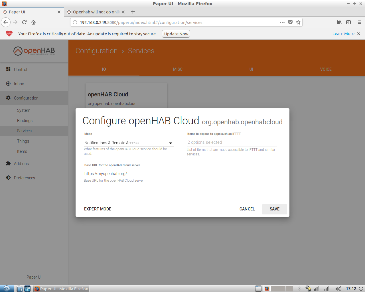 Secondly to connect to your setup outside of your own WiFi you can install the openHAB cloud binding and setup your cloud service. There are other options, but I don’t have experience with that myself.