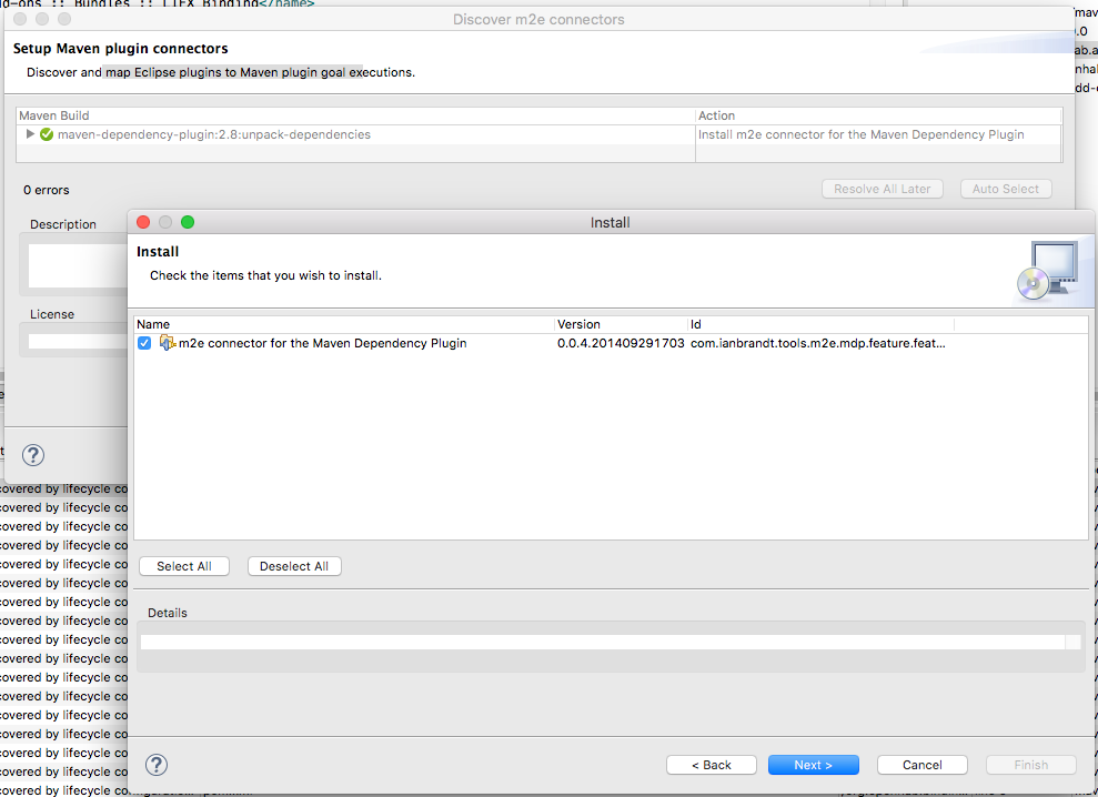 As I want to work on a binding, I installed both OpenHAB Development and OpenHAB Add-Ons. After a successful install, all the “first run” tasks seemed to run without problems. However, almost all projects in OH2 Add-Ons throw an error in their pom.xml: “Plugin execution not covered by lifecycle configuration: org.apache.maven.plugins:maven-dependency-plugin:2.8:unpack-dependencies (execution: embed-dependencies, phase: process-sources)”
