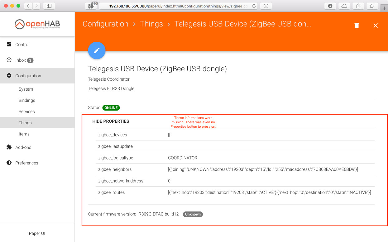 The Problem: After initializing the thing is going to “Status: OFFLINE Failed to initialize ZigBee transport layer”. The serial port should be okay, at least answers come back from the stick. With Minicom I can also connect to ttyUSB0 (if i disconnect OH) and send the stick AT commands to which he responds.