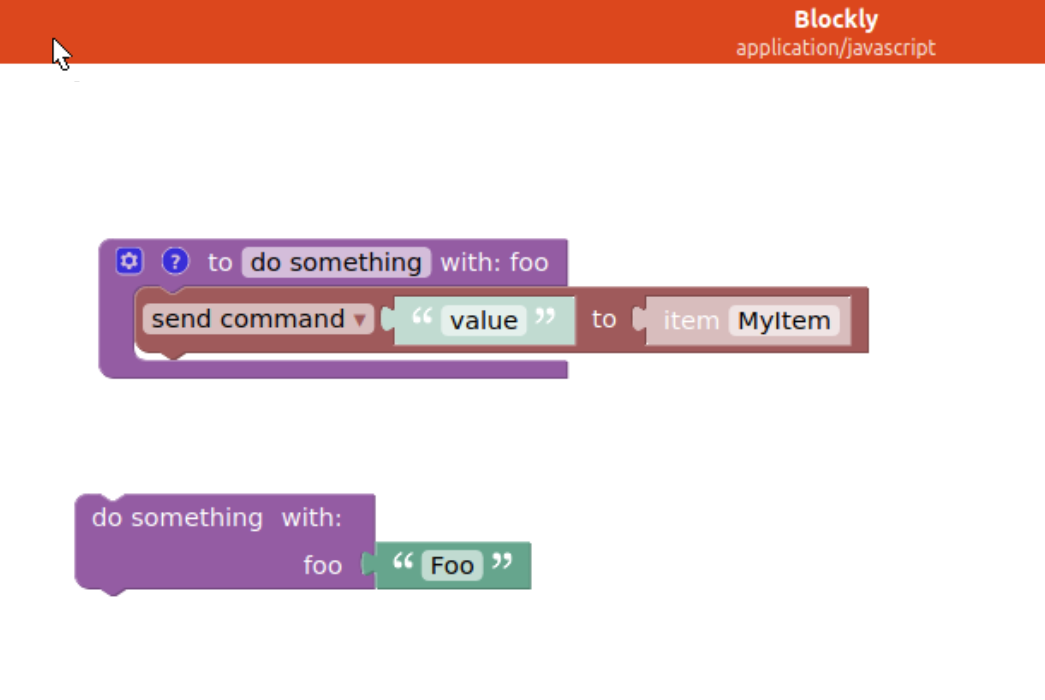 If you want a function, perhaps because you have something you want to encapsulate so you ca call it from more than one place in the Script Action, then when you create the function there will be a new block added to “Functions” with the name of the function. Drag that to the screen, set any arguments if necessary (I have a String argument named “foo” set to “Foo” in this screen shot).