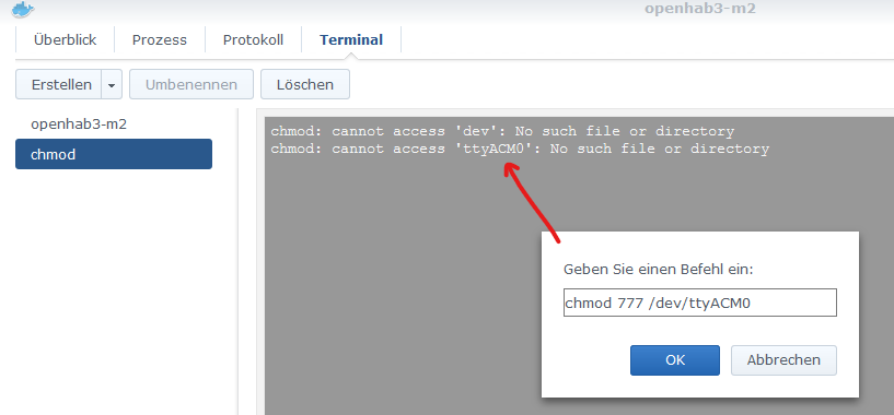 I have now added these 2 scribts on the syno, in the docker container i have now the same rights (crw-rw---- 1 root dialout 166, 0 Feb 26 09:40 /dev/ttyACM0) but i have not the openhab user on the synology, the openhab user is only in the container, in the docker container i have added the user to the groups, but the problem is the same, i will try today to give the stick on the synology full acces ( chmod 777 /dev/ttyAM0)
