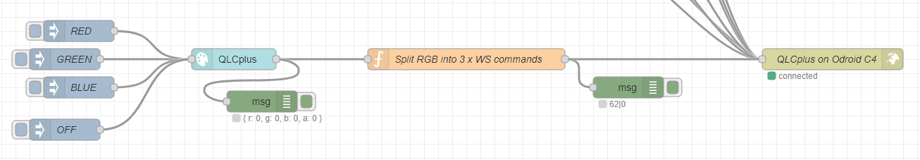 "func": "var RED = msg.payload.r;\nvar GREEN = msg.payload.g;\nvar BLUE = msg.payload.b;\nvar ALPHA = msg.payload.a;\n\nvar REDch = 60, GREENch = 61, BLUEch = 62; // The sliders in QLCplus that control the RGB elements\n\n\nvar REDmsg = { payload:REDch + \"|\" + RED };\nvar GREENmsg = { payload:GREENch + \"|\" + GREEN };\nvar BLUEmsg = { payload:BLUEch + \"|\" + BLUE };\n\n\nreturn [ [ REDmsg, GREENmsg, BLUEmsg ]];\n",