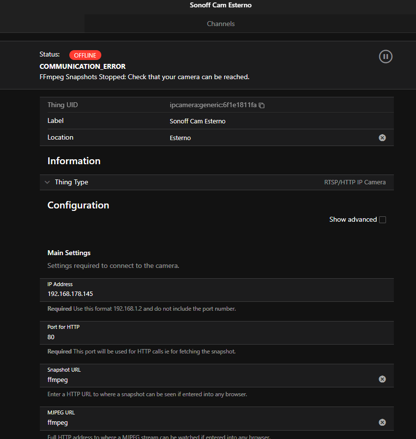 INFO openhab.event.ThingStatusInfoChangedEvent Thing 'ipcamera:generic:6f1e1811fa' changed from ONLINE to OFFLINE (COMMUNICATION_ERROR): FFmpeg Snapshots Stopped: Check that your camera can be reached.