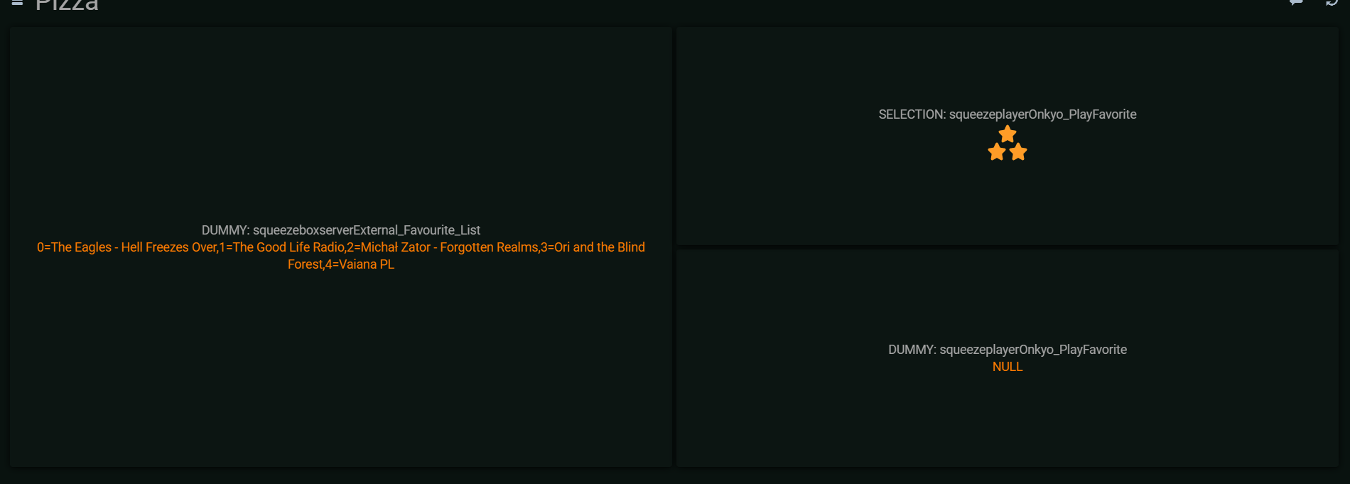 Hello, I have issue with the PlayFavorite which seems to not populate with selection widget neither in HABPanel nor in BasicUI. @mhilbush, did anything change recently in the binding or I have some error somewhere? It was working before correctly. I reinstalled binding and cleaned cache so far and still nothing. Item squeezeboxserverExternal_Favourite_List populates coreectly and I can see playlist in PaperUi or basicui, however it looks like there is lack of transport from squeezeboxserverExternal_Favourite_List to PlayFavorite.