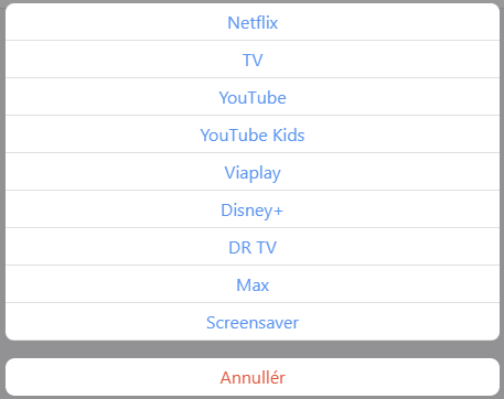 String LGTV_Application "Application" (LGTV) ["Control", "App"] { channel="lgwebos:WebOSTV:tv:appLauncher", stateDescription="" [options="netflix=Netflix, com.webos.app.livetv=TV, youtube.leanback.v4=YouTube, youtube.leanback.kids.v4=YouTube Kids, viaplay-lg=Viaplay, com.disney.disneyplus-prod=Disney+, dk.dr.drtv.webos2=DR TV, com.wbd.stream=Max, com.webos.app.screensaver=Screensaver"] }