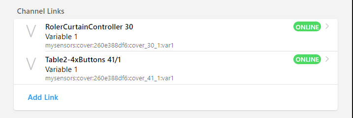 Vice versa when I click the button in OpenHab to set V_VAR1 to UP, the cover will go fully up to 0%. When it reach the target, both channels are updated by controller, V_PERCENTAGE=0, V_VAR1=STOP.