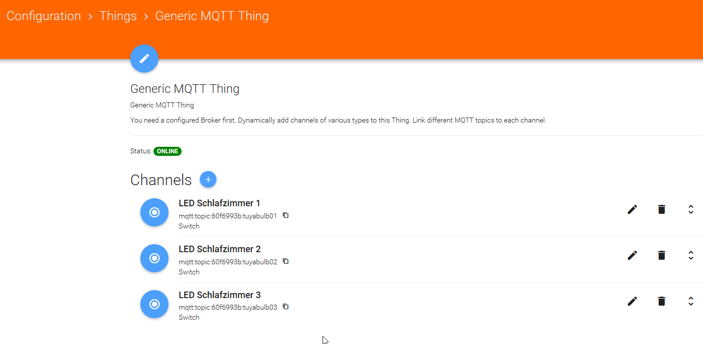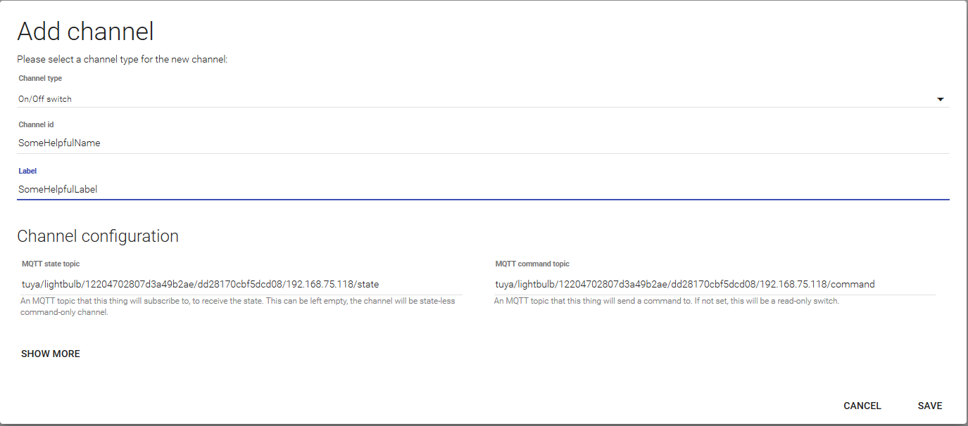Be careful when choosing the channelID cause it can not be changed later, I used “tuyabulb01” for example, and “Tuya LED 1” as Label. It is very helpful to identify the lamps later in the UI: