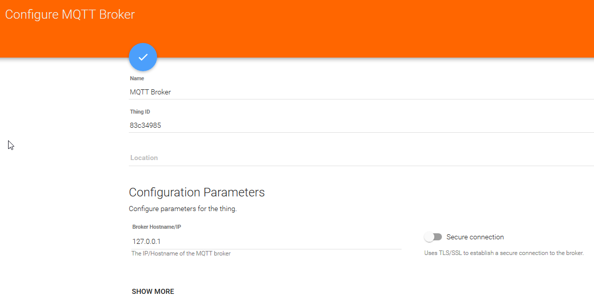 Next we need a MQTT bridge which connects our MQTT-things to the broker. Go to Inbox, select “+” to add a thing, choose MQTT-Binding and “add manually”. We need the “MQTT Broker”. Enter “127.0.0.1” as IP-Adress. That’S all and save.