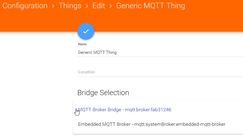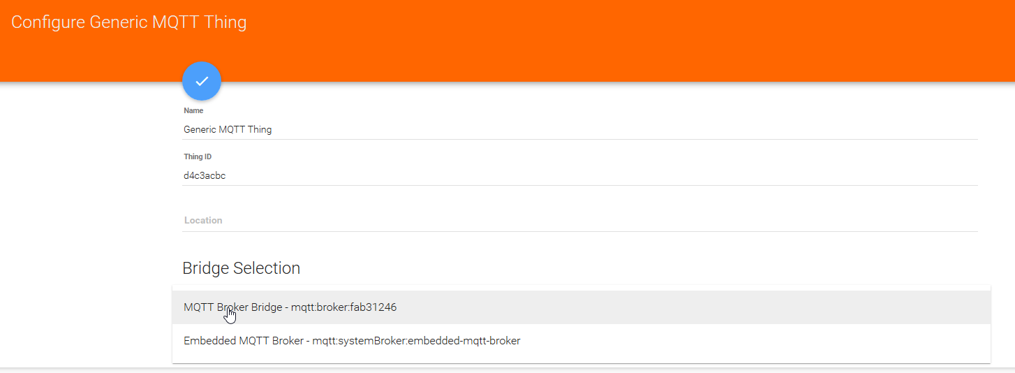 Now, again we to Inbox, select “+” to add a thing, choose MQTT-Binding, and this time the “Generic MQTT Thing”. And while we add it, we select the MQTT-Bridge we have created in the step before: