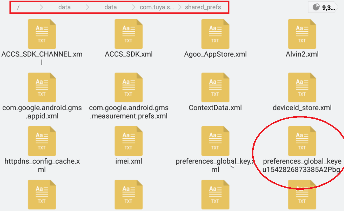 and click it. ES File Explorer will open it. On the first look, this file looks weird, but you will find the ID of your bulb there, and next to it… the desired local key!