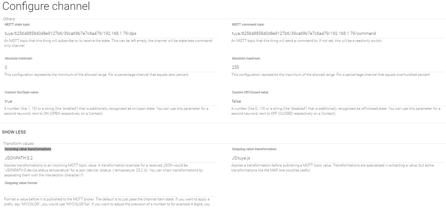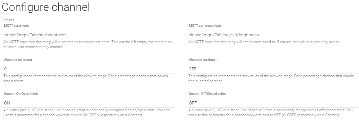 Dimmer TableLight “Table Light [%d %%]” {channel=“mqtt:topic:d2cfb0fd:Dimmer”, alexa=“Lighting”}