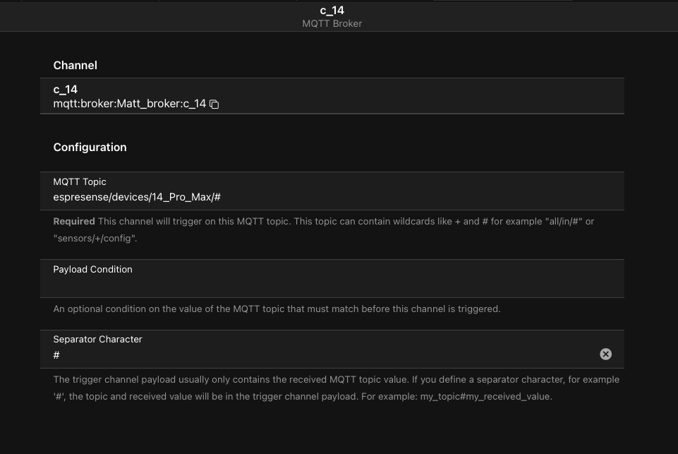 - Step 8: create one string typed MQTT “JSON complete” channel per ESP32 per bluetooth device you would like to detect, with state topic “espresense/devices/[bluetooth tag MAC]/[ESP32 ID]” as per the MQTT stream from step 4 (you can to identify your bluetooth tag MACs from the MQTT message stream by moving them around a little and looking at distance changes or whatever)