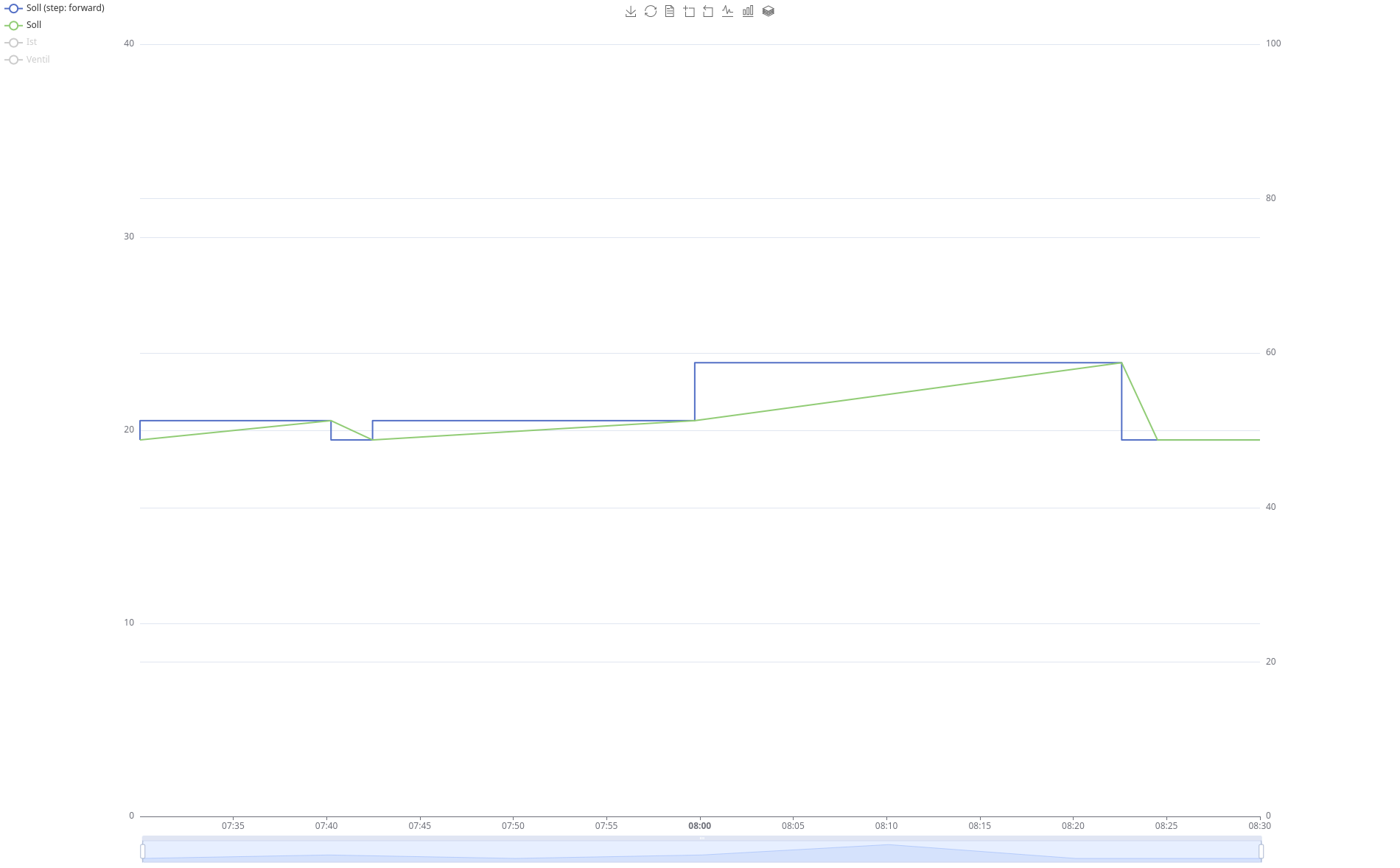 The green line is the same without steps. The desired temperature is set at 8:00 to 20°C (green line) but the stepped blue line takes this into the past and using this value from 7:41. Thanks