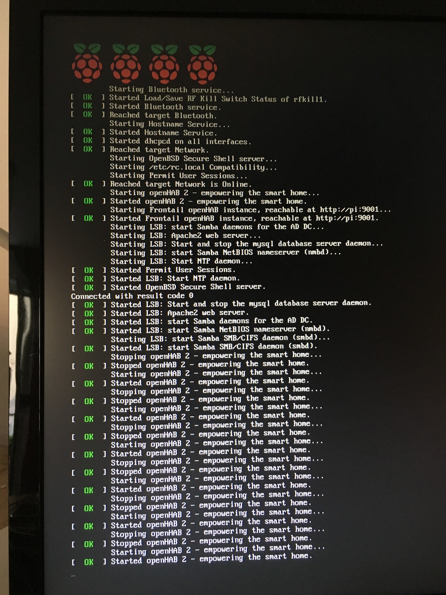 I am using a raspberry pi model 3 with openhab 2.2 snapshot and openhabian (8GB SD Intenso). Everything was working since last week: After a restart, my RPI doesn’t boot completely - there is a permanent loop which says: