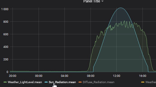 I recently added a simple light sensor outside the house to get an idea of how much light/sun is coming from the sky. It’s a simple LDR giving a 0-1024 value (green curve on the attachment). Mainly tuned for low light levels so the top of the curve is a little bit compressed.
