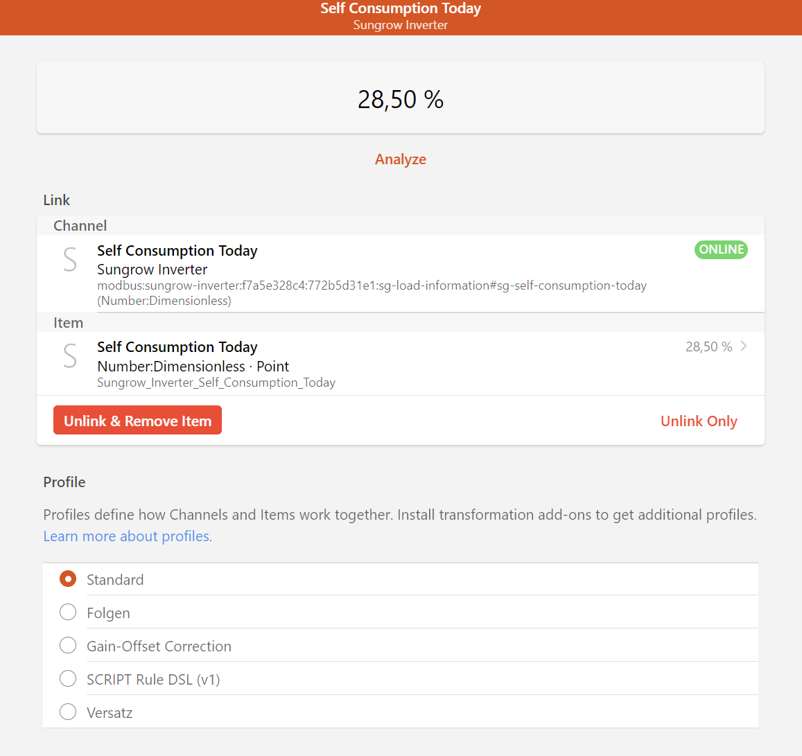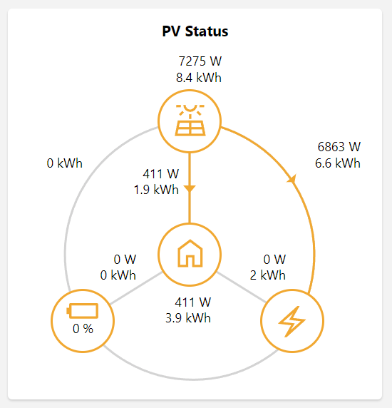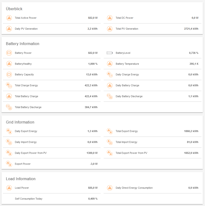 {"model": "SH8.0RT", "serial_number": "A222xxxxx1", "level": 2, "scan_interval": 30, "use_local_time": true, "smart_meter": false, "connection": "sungrow", "slave": 1, "start_time": "", "host": "192.168.2.125", "port": 502, "timeout": 10, "retries": 3, "RetryOnEmpty": false, "device_type_code": "SH8.0RT", "run_state": "ON", "last_reset": "2023-06-26 00:00:17", "daily_export_to_grid": 5.250983333333331, "daily_import_from_grid": 0.04772500000000002, "protocol_number": 1094856704, "protocol_version": 16781568, "arm_software_version": 16722, "dsp_software_version": 19780, "nominal_active_power": 8.0, "output_type": "3P4L", "daily_power_yields": 13.7, "total_power_yields": 25667, "internal_temperature": 40.8, "mppt_1_voltage": 246.8, "mppt_1_current": 0.8, "mppt_2_voltage": 521.0, "mppt_2_current": 1.2, "total_dc_power": 870, "phase_a_voltage": 235.2, "phase_b_voltage": 234.1, "phase_c_voltage": 236.2, "total_reactive_power": -4, "power_factor": 1.0, "grid_frequency": 49.9, "active_power_regulation_setpoint": 0, "daily_running_time": 0, "export_limit_min": 0, "export_limit_max": 9750, "bdc_rated_power": 8000, "bms_max_charging_current": 0, "bms_max_discharging_current": 25, "pv_power_of_today": 2439, "daily_pv_energy_yields": 35.6, "monthly_pv_energy_yields": 0, "yearly_pv_energy_yields": 0.0, "direct_power_consumption_today_pv": 451, "direct_power_consumption_pv": 4.1, "direct_power_consumption_monthly_pv": 0.0, "direct_power_consumption_yearly_pv": 0.0, "export_power_from_pv_today": 1988, "export_power_from_pv": 26.8, "export_power_from_pv_monthly": 0.0, "export_power_from_pv_yearly": 0.0, "battery_charge_power_from_pv_today": 0.0, "battery_charge_power_from_pv": 4.7, "battery_charge_power_from_pv_monthly": 0.0, "battery_charge_power_from_pv_yearly": 0.0, "system_state": "Run", "running_state": 25, "state_power_generated_from_pv": 1, "state_battery_charging": 0, "state_battery_discharging": 0, "state_load_active": 1, "state_feed_into_grid": 1, "state_import_from_grid": 0, "state_power_generated_from_load": 0, "daily_pv_generation": 14.9, "total_pv_generation": 2694.7, "daily_pv_export": 8.6, "total_pv_export": 1829.5, "load_power_hybrid": 317, "export_power_hybrid": 553, "daily_battery_charge_from_pv": 4.1, "total_battery_charge_from_pv": 422.3, "co2_reduction": 1886.2, "daily_direct_energy_consumption": 2.2, "total_direct_energy_consumption": 442.9, "battery_voltage": 218.3, "battery_current": 0.0, "battery_power": 0, "battery_level": 100.0, "battery_state_of_healthy": 100.0, "battery_temperature": 25.0, "daily_battery_discharge_energy": 3.8, "total_battery_discharge_energy": 383.6, "self_consumption_of_day": 20.3, "grid_state": null, "phase_a_current": 1.2, "phase_b_current": 1.2, "phase_c_current": 1.2, "total_active_power": 870, "daily_import_energy": 0.0, "total_import_energy": 81.8, "daily_charge_energy": 4.1, "total_charge_energy": 422.2, "drm_state": 255, "daily_export_energy": 8.7, "total_export_energy": 1836.8, "start_stop": "Start", "power_limitation_switch": "Enable", "power_limitation_setting": 100.0, "power_factor_setting": 0.0, "reactive_power_adjustment_mode": "Off", "reactive_power_percentage_setting": 0.0, "power_limitation_adjustment": 0.0, "reactive_power_adjustment": 0.0, "start_charging_power": 0, "start_discharging_power": 0, "energy_meter_comm": "Enabled", "export_power_limitation": "Disabled", "soc_reserve": 0, "timestamp": "2023-06-26 10:22:08", "export_to_grid": 553, "import_from_grid": 0}