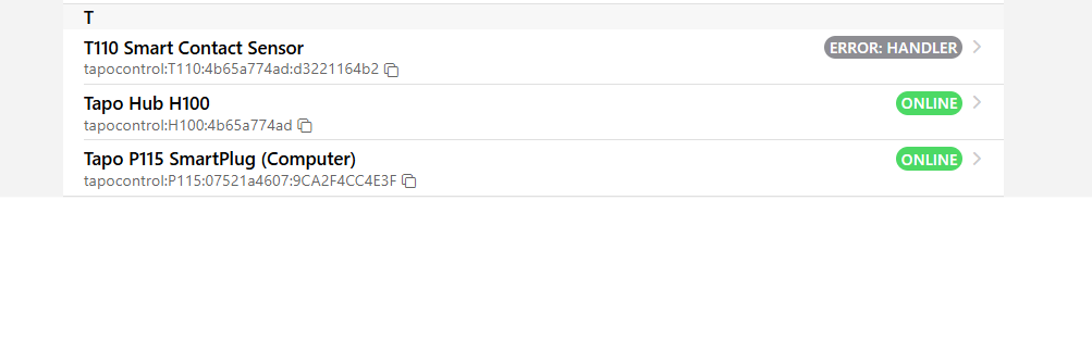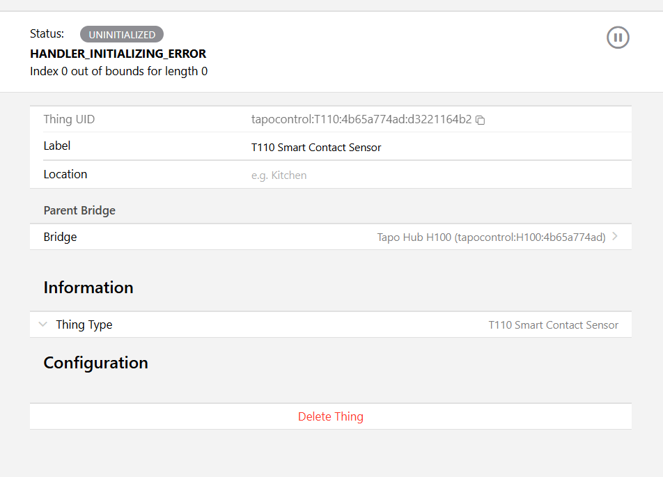 2024-11-16 07:40:54.489 [ERROR] [core.thing.internal.ThingManagerImpl] - Exception occurred while initializing handler of thing 'tapocontrol:T110:4b65a774ad:d3221164b2': Index 1 out of bounds for length 1