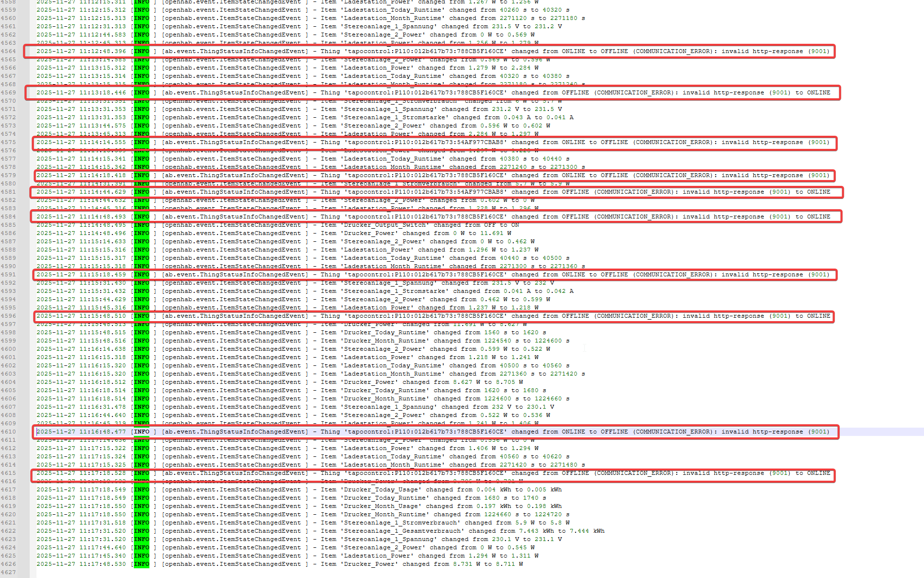 Hi, I have the same problem since today on a P110. Yesterday everything was working fine with the unchanged Version openHAB 5.0.2
