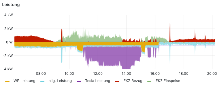 Green: excess power, Red: power draw from grid (to be avoided), Yellow: heat pump, Blue: non-heat pump power, Purple: wallbox. Not shown is the overall PV production, which would be the sum of Green+Yellow+Blue+Purple minus any Red, so about 4kW on this day in February.